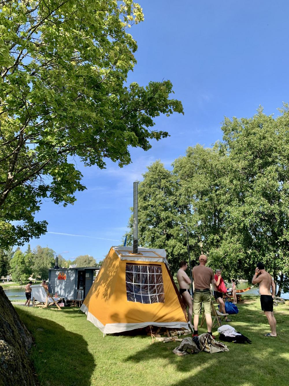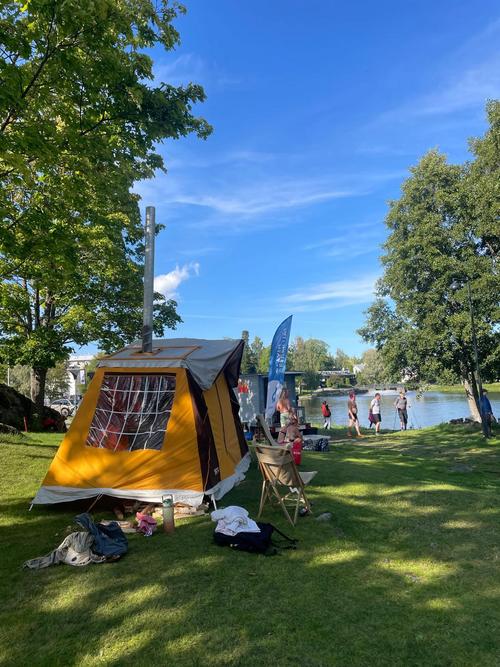 Alueella on pukuhuonekatos/teltta, jossa voi vaihtaa tarvittaessa vaatteita.