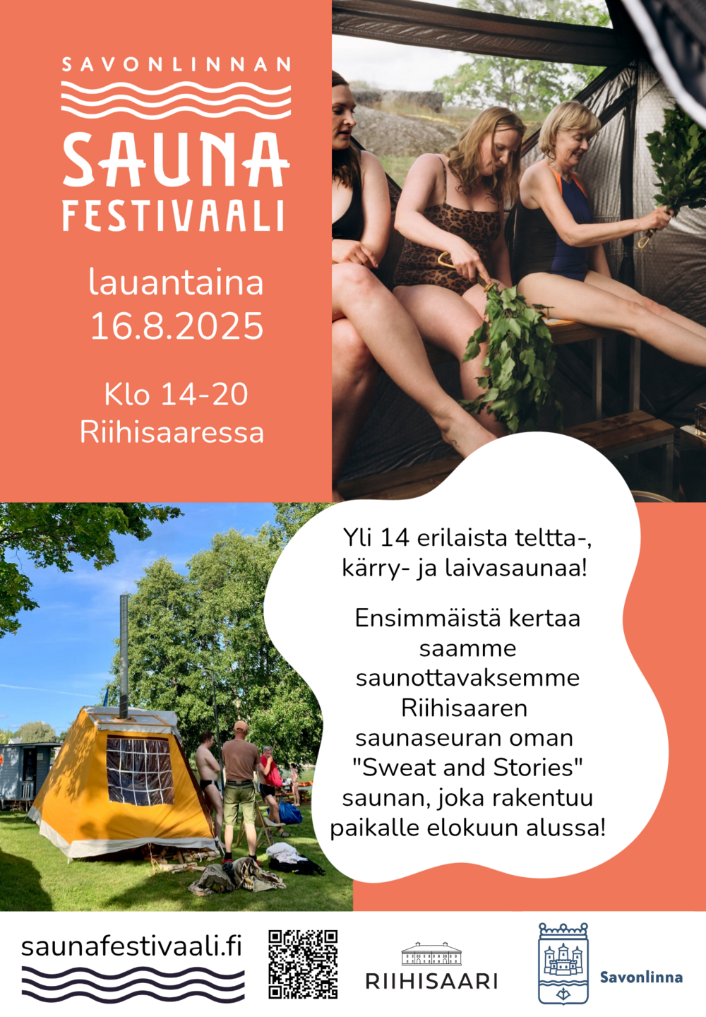 Ensimmäinen saunafestivaali järjestettiin Riihisaaren saunaseuran toimesta Savonlinnan Riihisaaressa, Olavinlinnan maisemissa 17.8.2024. Päätös ensimmäisen saunafestivaalin järjestämisestä tehtiin kesäkuussa 2024, jonka jälkeen yhdistys laittoi hommat pyörimään ja kiukaat kuumenemaan. Tavoitimme ensimmäiseen festivaaliin paljon uusia saunoja, kiitos saunaihmisten avuliaisuuden ja tiiviiden verkostojen, ja saimme paikalle kymmenkunta saunaa ja paljun. Tapahtuma tavoitti 180 vierailijaa, keräsi hyvää palautetta ja kiinnosti mediassa. Mukana oli laiva- teltta- ja kärrysaunoja, sekä palju ja ruokakojuja. Riihisaaren rannasta pääsi pulahtamaan virkistävään Saimaaseen, kansallismaisema ja Olavinlinna kaiken tämän taustalla. Koko päivä oli kiitelty, ja sen ohjelmassa oli luentoja, saunajoogaa ja rentoa yhdessäoloa Riihisaaren lämpimillä kallioilla. Täydellinen saunafestivaali, kuten paikallislehtikin asian ilmaisi: Aivan täydellinen saunafestivaali!